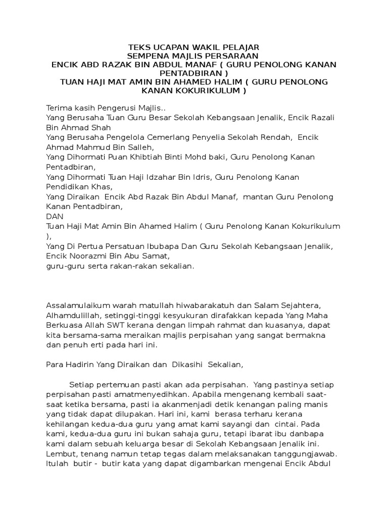 Ucapan Wakil Pelajar Majlis Perpisahan Guru Berpindah Youtube. TEKS UCAPAN UNTUK MAJLIS PERSARAAN GURU APPRICIATING AND SENT OFF TEKS UCAPAN PENGETUA. Majlis persaraan yang diadakan pada pagi ini amat bermakna bukan sahaja kepada guru-guru bahkan juga kepada murid-murid Sek.