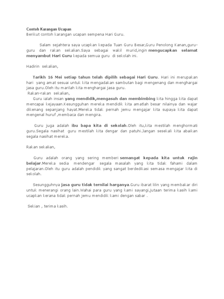 Cara-cara Memupuk Amalan Membaca Dalam Kalangan Masyarakat. Contoh karangan ucapan sambutan hari kemerdekaan rasmi x. Guru-guru yang disayangi serta rakan-rakan Pada 16 Mei setiap tahun kita akan meraikan Hari Guru di seluruh negara.
