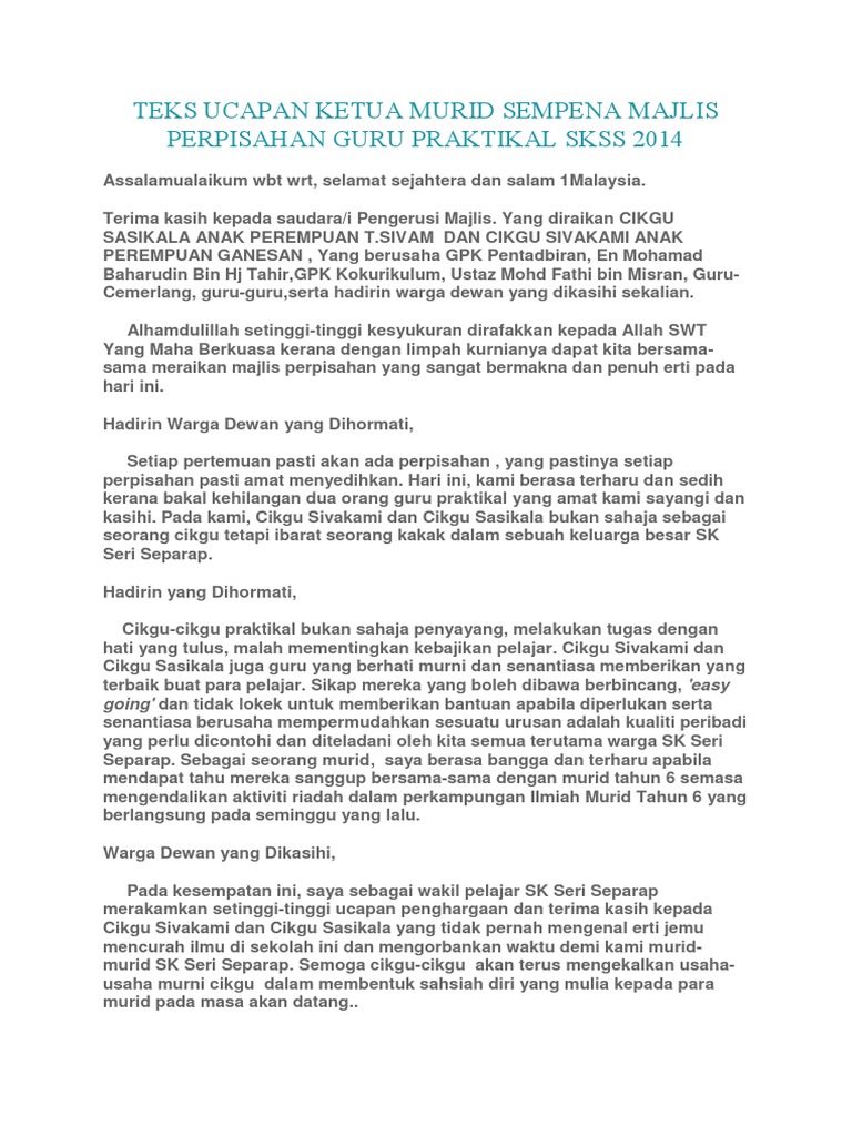Teks Ucapan Ketua Murid Sempena Majlis Perpisahan Guru Praktikal Skss 2014 Pdf