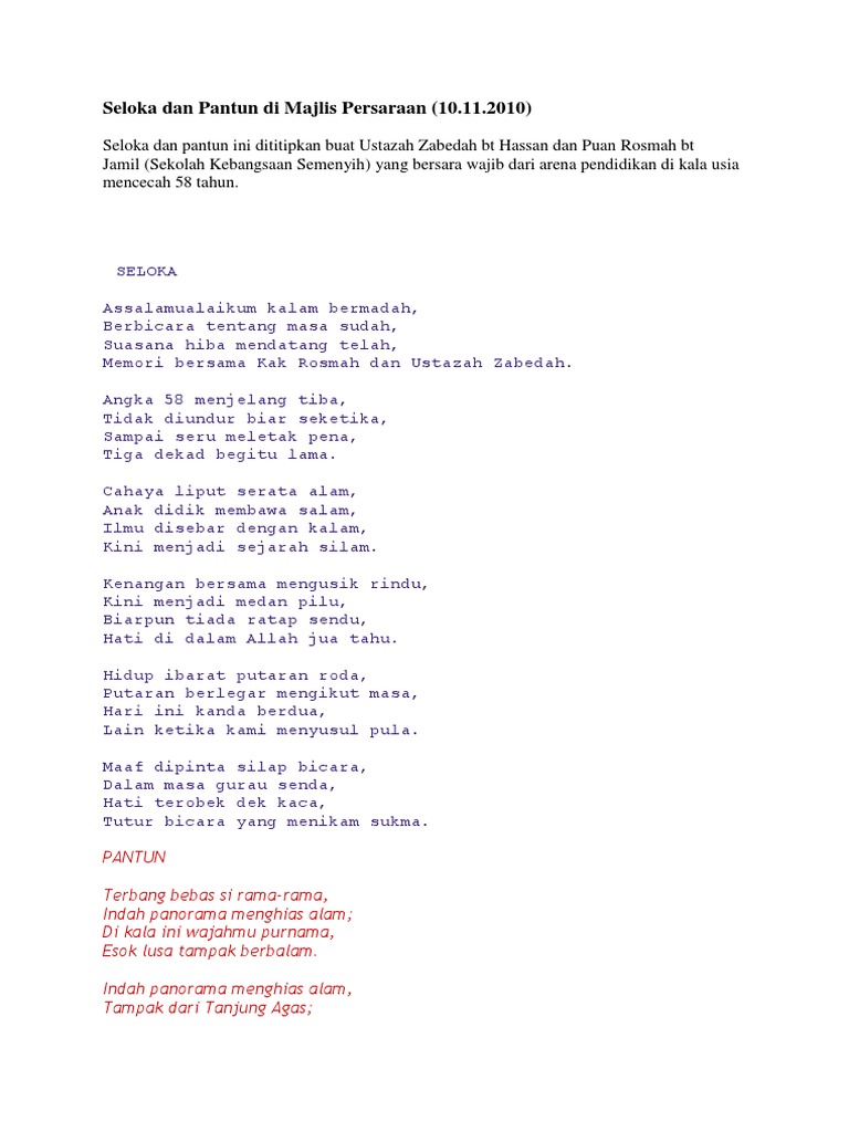 Seloka dan Pantun di Majlis Persaraan 10112010 Seloka dan pantun ini dititipkan buat Ustazah Zabedah bt Hassan dan Puan Rosmah bt Jamil Sekolah Kebangsaan Semenyih yang bersara wajib dari arena pendidikan di kala usia mencecah 58 tahun. Isi pantun kaya dengan khazanah ilmu dan Berperanan sebagai alat untuk menyampaikan nasihat pesanan teguran kiasan sindiran dan melahirkan perasaan hiba. TEKS PENGACARA MAJLIS PERSARAAN.