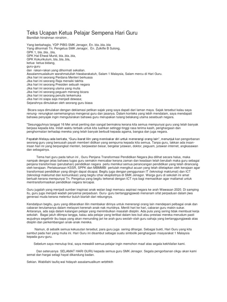 Teks Ucapan Ketua Pelajar Sempena Hari Guru Pdf