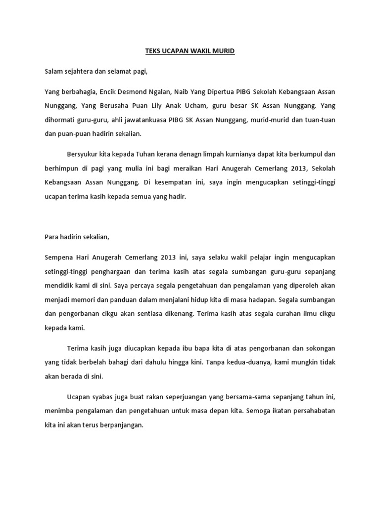 Ucapan wakil pelajar Download Now Download. TEKS UCAPAN KETUA MURID SEMPENA MAJLIS PERTUKARAN PENGETUA-MAJLIS SEIKHLAS HATI SETULUS BUDI LAMBAIAN KASIH. 01 2014 40778 views Shaifull Niell Follow Pegawai Pendidikan at kementerian pelajaran.