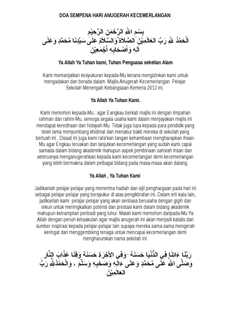 View DOA_SEMPENA_HARI_ANUGERAH_KECEMERLANGANdoc from RELIGION MISC at Laikipia University. Doa sempena hari anugerah kecemerlangan بسم الله الرحمن الرحيم الحمد لله رب العالمين والعاقبة للمتقين والصلاة والسلام على سيدنا محمد. Doa mesyuarat agung pibg.