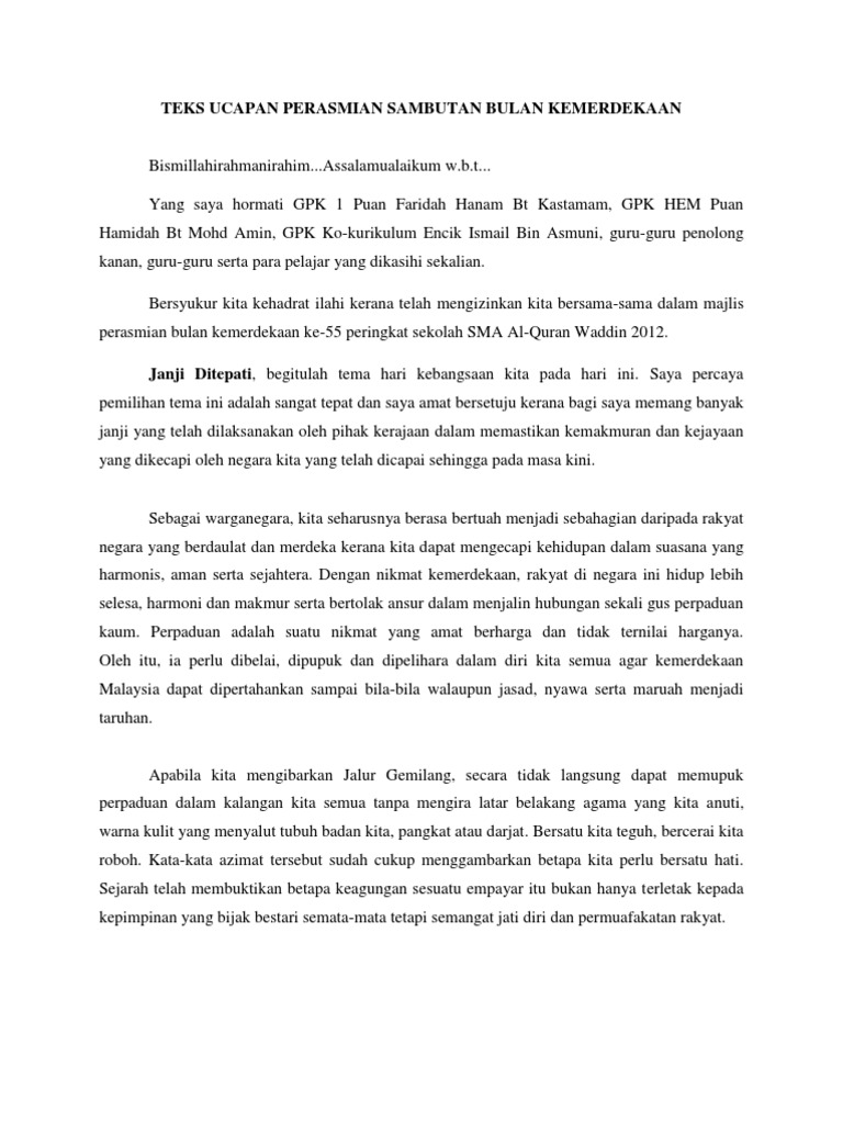 Terlebih dahulu saya ingin melahirkan rasa gembira dan bersyukur pada hari ini kita dapat bersama-sama berkumpul sempena Pelancaran Bulan Kemerdekaan ke 57 peringkat sekolah untuk tahun 2014. Go to our diagnostics page to see whats wrong. UCAPAN SEMPENA BULAN KEMERDEKAAN.
